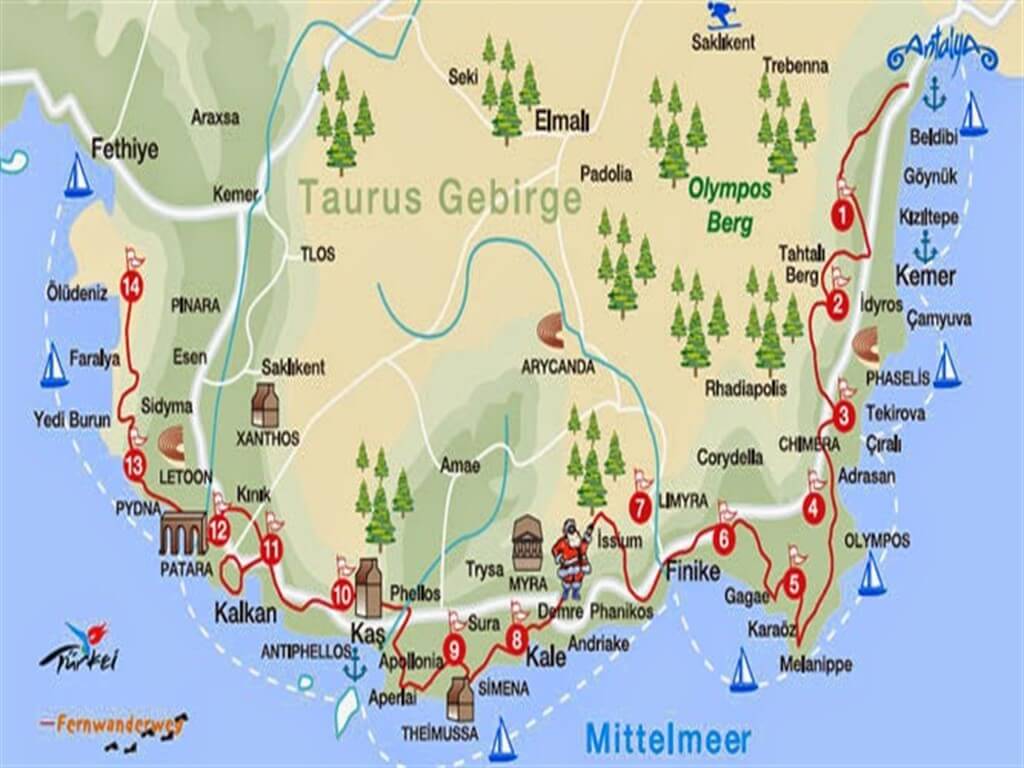 1999’da işaretleyen Likya Yolu, Türkiye’nin ilk uzun mesafe doğa yürüyüş yoludur. Antik Likya kentleri ve uzak köylerden geçen rota, çoğunlukla eski patikalar ve toprak yolları takip ediyor. Kimi zaman Akdeniz sahiline bakarak kimi zaman da manzaralı dağlar, tepeler arasında giden bu yol, bölgenin doğal güzelliklerini ve kültürünü yaşama fırsatını spor severler için sağlıyor.